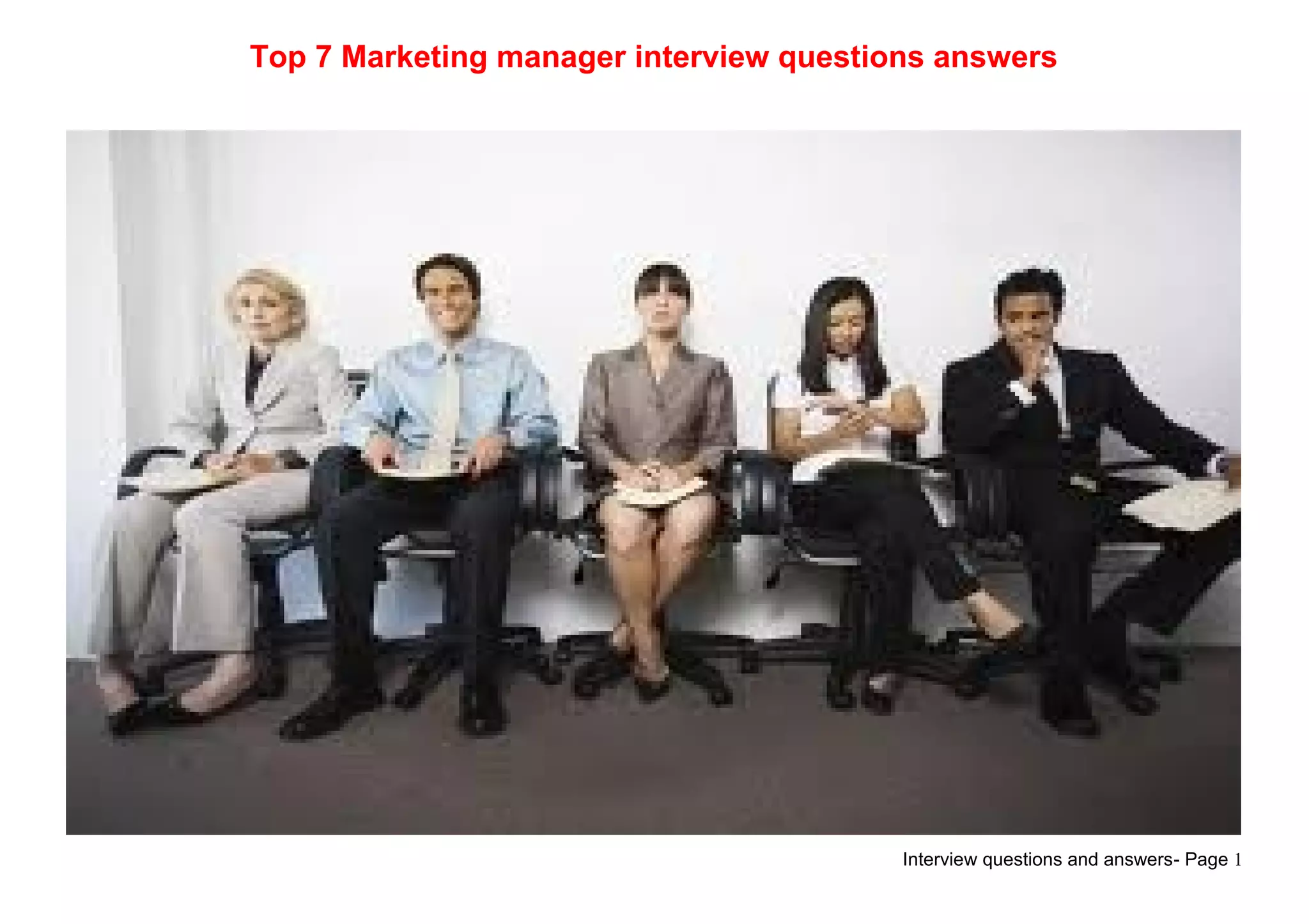 This document provides tips and sample answers for common marketing manager interview questions. It discusses how to answer questions about yourself, your strengths, career goals, reasons for leaving previous jobs, weaknesses, knowledge of the organization, and ways you've improved your marketing knowledge. For each question, it offers steps and guidelines for effective responses, including giving relevant examples from your background, connecting your skills to the role, and avoiding negative statements. Sample answers are provided for questions about your strengths, career goals, reasons for leaving a job, knowledge of the organization, and self-improvement activities.