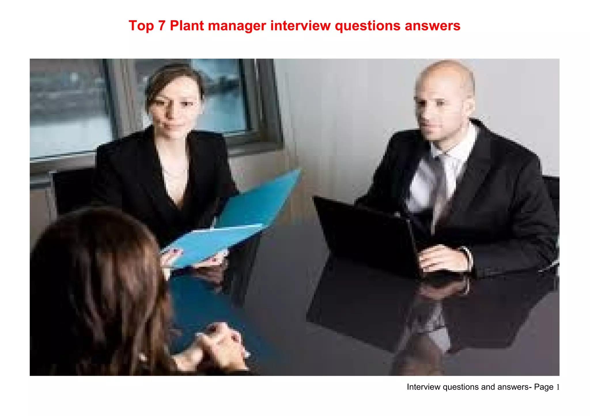 This document provides tips and sample answers for common interview questions for a plant manager position. It discusses how to answer questions about yourself, your strengths, career goals, reasons for leaving previous jobs, weaknesses, knowledge of the organization, and ways you have improved your skills. For each question, it offers steps to prepare, things to avoid saying, and examples of effective answers. The document aims to help candidates understand what interviewers want to learn and how to position their responses in a positive light.