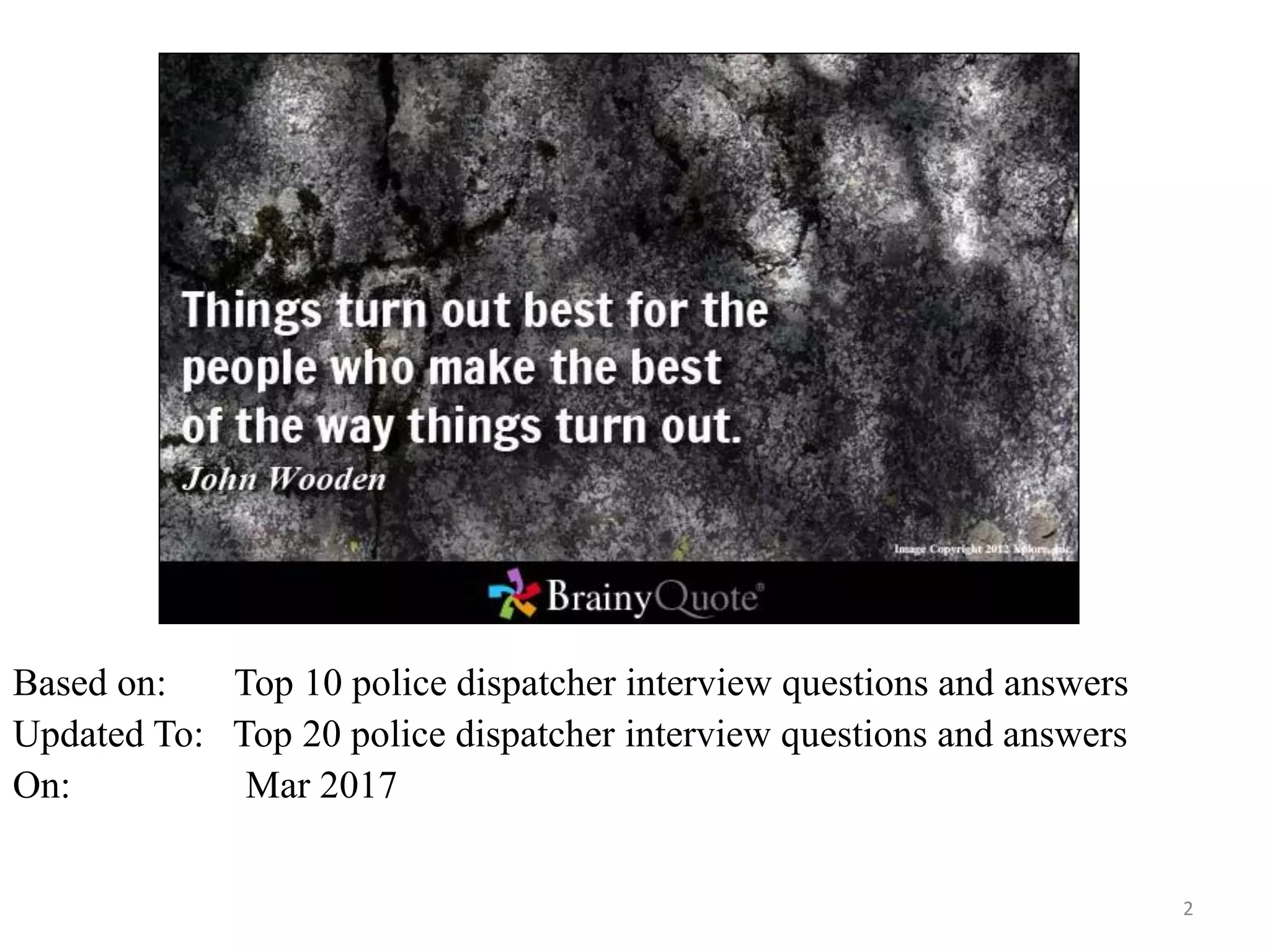 This document provides a summary of 20 potential interview questions and answers for a police dispatcher position. It includes answers to common questions like "tell me about yourself", "why did you choose this career", and "what are your strengths and weaknesses". It also provides sample responses to more challenging questions regarding following improper orders, keeping a cool head under pressure, past drug use, financial issues, and criminal history. The document aims to help candidates prepare compelling answers to typical interview questions for this role.