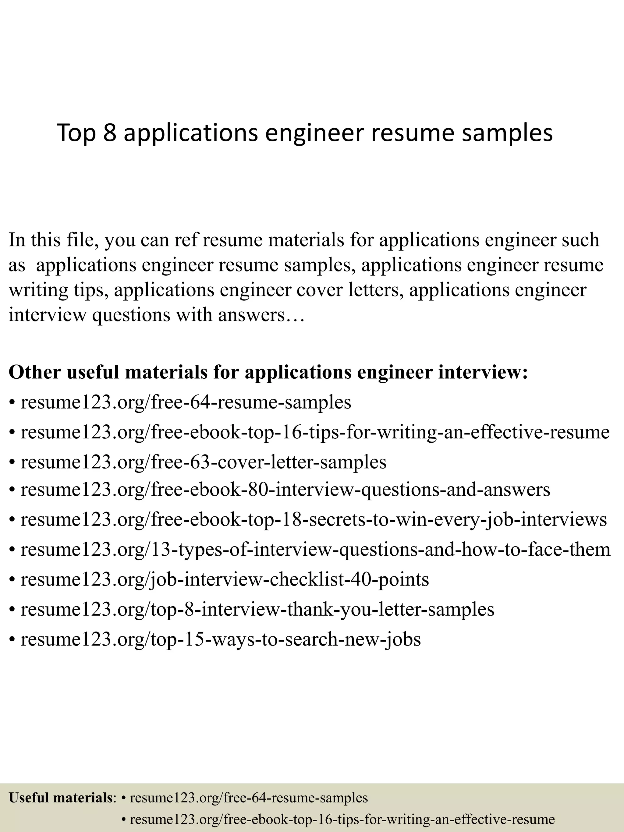 The document provides information about resume samples, tips, cover letters, and interview questions for applications engineers. It lists several useful resources from resume123.org, including resume samples, tips for writing effective resumes, cover letter samples, interview questions and answers, secrets to winning job interviews, types of interview questions, and tips for job searching.