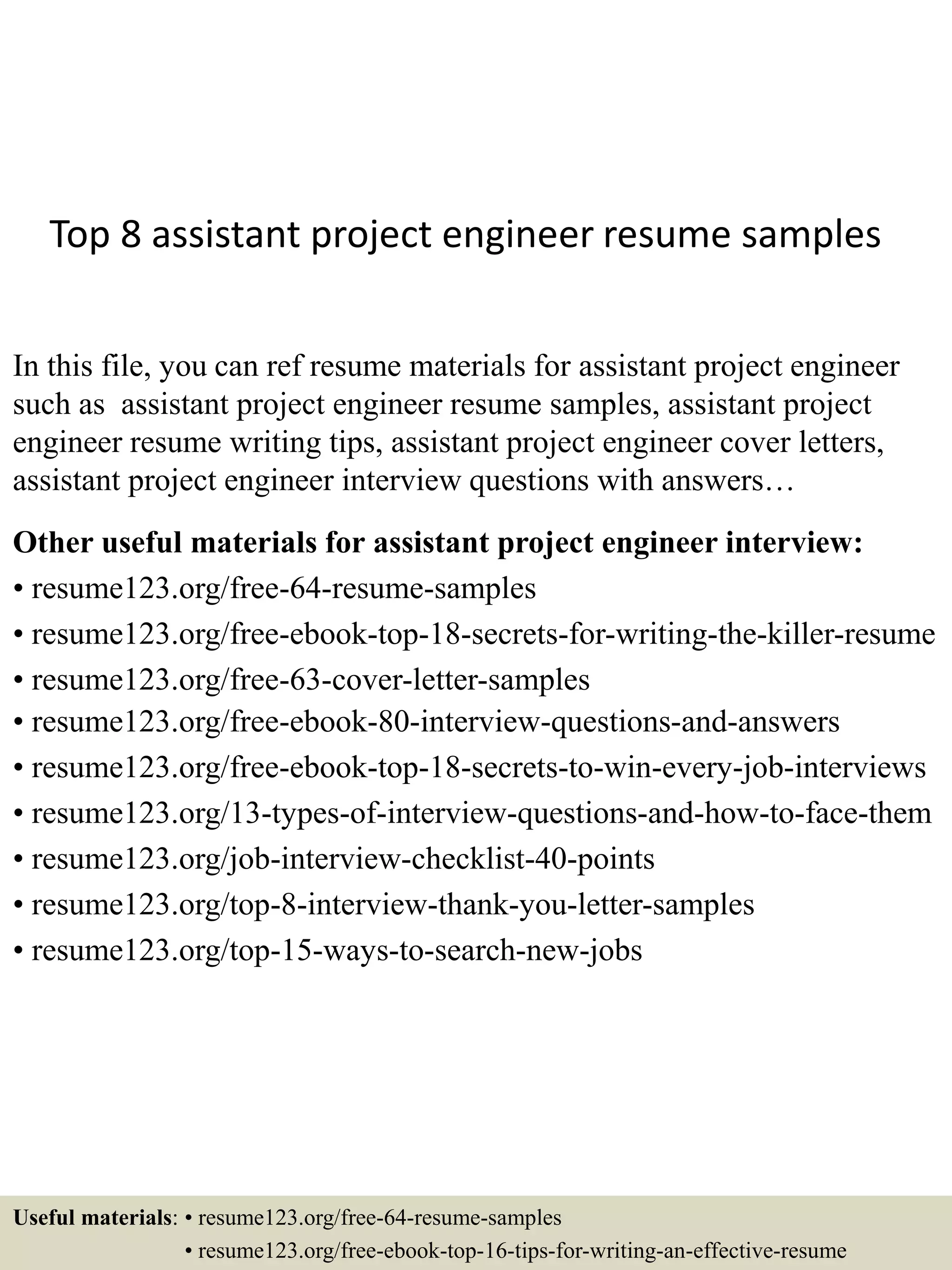 The document provides resources for assistant project engineers seeking employment, including resume samples of different formats (chronological, functional, etc.), cover letter samples, interview questions and answers, job search tips, and links to additional materials on resume writing, interview preparation, and career development. The resources are intended to help assistant project engineers develop strong application materials and perform well during the hiring process.