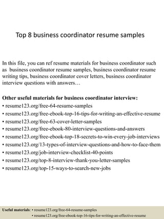 The document provides resources for business coordinator resume samples, cover letters, and interview preparation materials. It lists resume templates, tips for writing effective resumes, cover letter samples, interview questions and answers, secrets to winning interviews, types of interview questions, interview checklists, and thank you letter samples. It also provides related career fields and job titles that could use the resume examples.