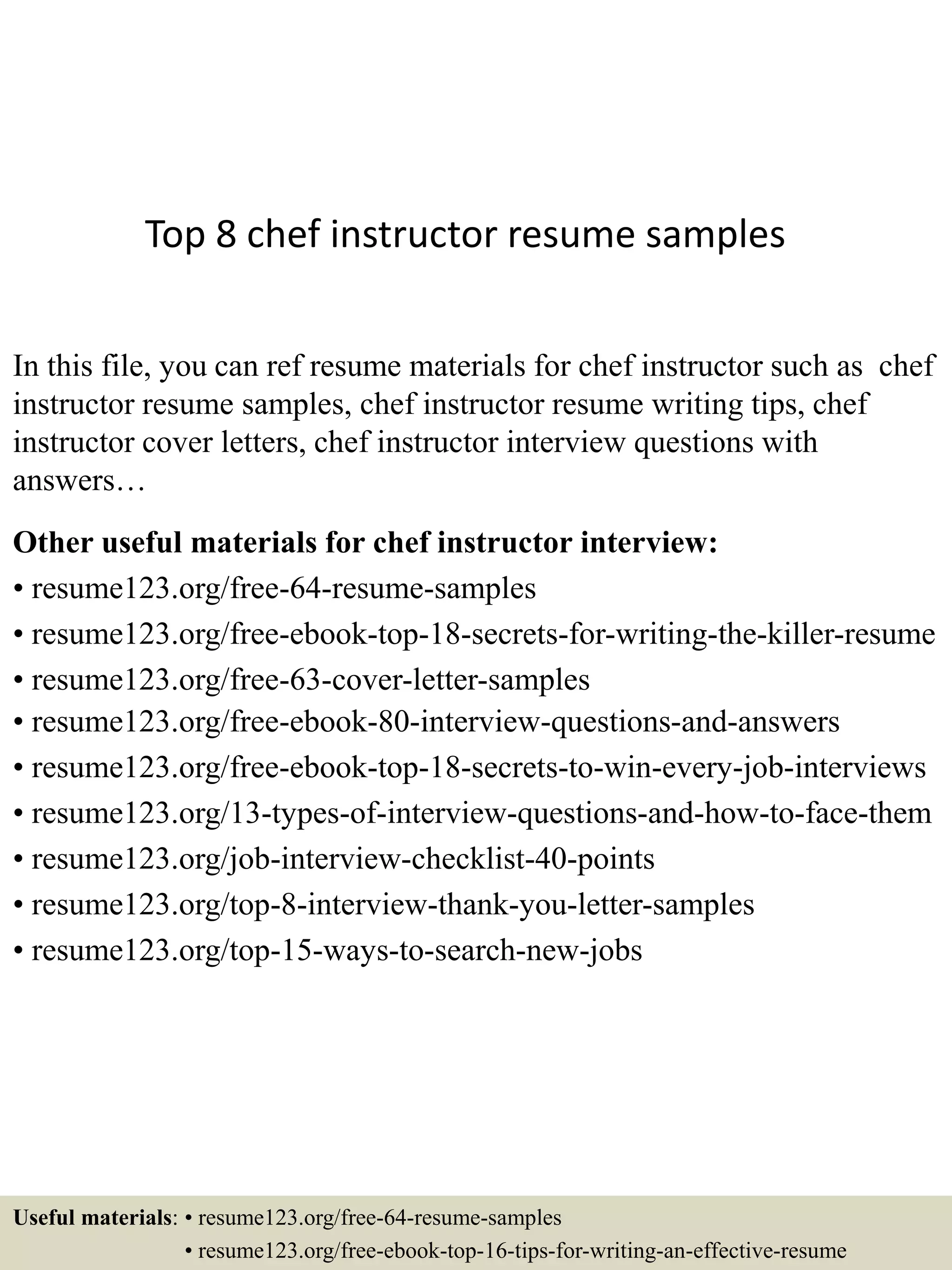 The document provides information about resume samples, templates, and other career resources for chef instructors available on the website resume123.org. It lists top 8 chef instructor resume samples and other useful materials such as resume samples, cover letter samples, interview questions and answers, job interview guides, and career development resources. The document recommends specific resume types (chronological, functional, curriculum vitae etc.) that different job seekers could use depending on their experience and career goals. It also lists some fields and job levels where the provided resume samples could be applicable.