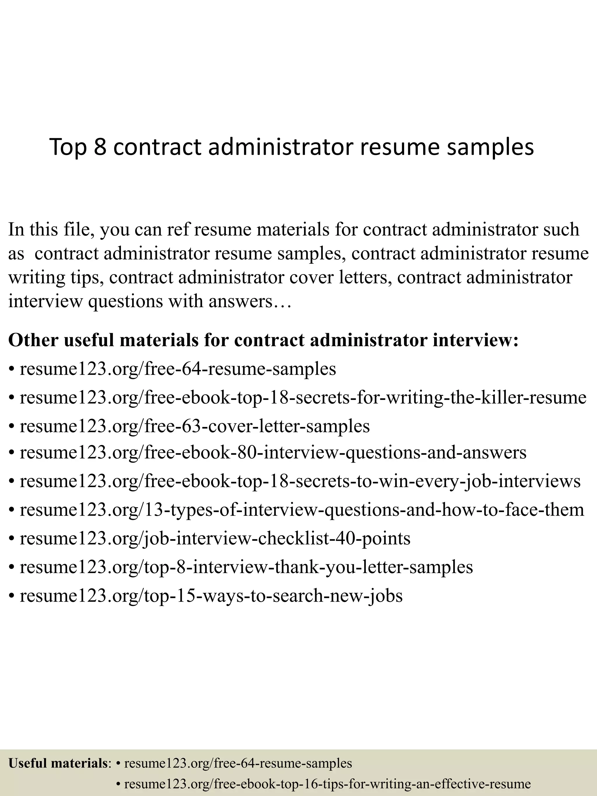 This document provides information about resume formats and samples for contract administrators. It discusses the main resume types including chronological, functional, curriculum vitae (CV), combination, targeted, professional, new graduate, and executive resumes. It also provides links to additional resume samples and tips on resume writing, cover letters, and interview preparation for contract administrator roles.