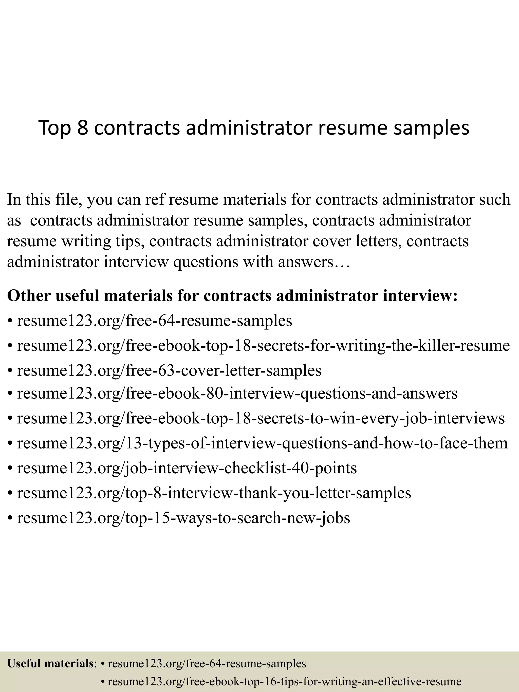 The document provides an overview of different resume formats and samples for contracts administrators. It discusses the chronological, functional, curriculum vitae (CV), combination, targeted, professional, new graduate, and executive resume formats. It also provides links to additional resume and interview resources on resume123.org, including resume samples, tips for writing effective resumes, cover letter samples, interview questions and answers, and other job interview guides.