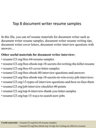 The document provides resources for document writers seeking resume samples, cover letters, and interview preparation materials. It lists top resume types including chronological, functional, curriculum vitae, combination, targeted, professional, new graduate, and executive resumes. It also provides links to interview questions, thank you letter samples, job searching tips, and career development resources for document writers.