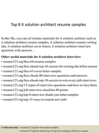 The document provides information about resume samples, templates, and other career resources for IT solution architects. It lists resume types including chronological, functional, curriculum vitae, combination, targeted, professional, and new graduate resumes. It also provides links to interview preparation materials, sample interview questions, cover letter examples, and more. The resources are aimed at helping IT solution architects with career and job search tasks like resume writing, interviewing, and career development.