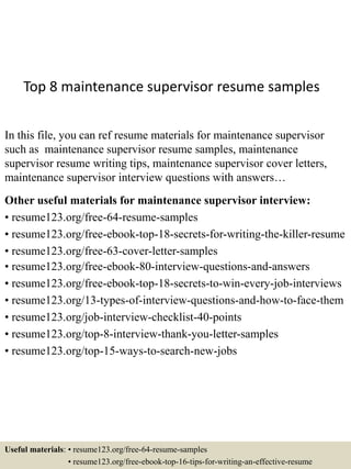 The document provides an overview of useful materials for maintenance supervisor interviews that are available on the resume123.org website, including resume samples, cover letters, interview questions and answers, job interview checklists, and tips for writing effective resumes, interview preparation, and thank you letters. It lists specific pages on the site that contain resume examples, ebooks with resume writing tips and common interview questions, as well as guides on various interview types and strategies.