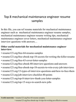 The document provides resources for mechanical maintenance engineers seeking employment, including resume samples, cover letter samples, interview questions and answers, and tips for writing resumes, cover letters, and preparing for interviews. It lists the website resume123.org which contains free resume templates, cover letter templates, interview questions and answers, career guides, and other job search resources for mechanical maintenance engineers and other roles.