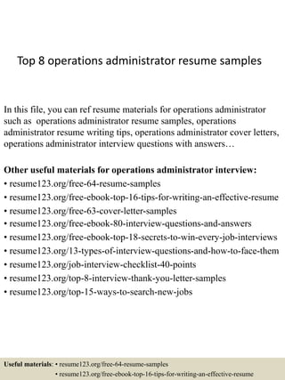This document provides resources for operations administrators seeking employment, including resume samples, cover letters, interview questions and answers, and tips for writing resumes and preparing for interviews. It lists top resume types, such as chronological, functional, curriculum vitae, combination, targeted, professional, new graduate, and executive resumes. It also provides links to additional materials on resumes, cover letters, interview questions, dress codes, testing, and closing statements to help operations administrators with the job searching and interview process.