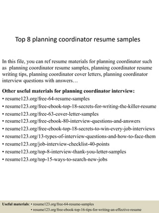 The document provides information about resume samples, templates, and other career resources for planning coordinators. It lists resume formats including chronological, functional, curriculum vitae, combination, targeted, professional, and new graduate resumes. It also provides links to planning coordinator interview questions, thank you letters, cover letters, resume examples, and other job search tools on the resume123.org website.
