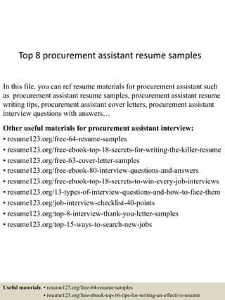 The document provides information about resume samples, templates, and other career resources for procurement assistants. It lists numerous links to procurement assistant resume examples, cover letter samples, interview questions and answers, ebooks with resume and interview tips, and other job search resources on the resume123.org website. The document is intended to provide procurement assistants with useful reference materials to aid in their job applications and career development.
