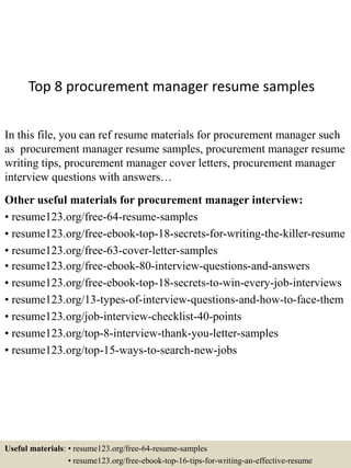 The document provides information about resume samples, templates, and other career resources for procurement managers. It includes links to procurement manager resume examples, cover letter samples, interview questions and answers, and other job search tools on the resume123.org website. The resources cover various resume formats, types of interviews, writing tips, and career development advice relevant for procurement manager positions.