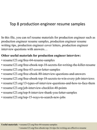 This document provides an overview of different types of resume formats and samples that can be used for a production engineer role. It includes summaries of chronological, functional, curriculum vitae (CV), combination, targeted, professional, new graduate, and executive resume formats. It also lists additional useful materials for production engineer interviews such as interview questions, tips for preparation, dress code guidance and more that are available on the resume123.org website.