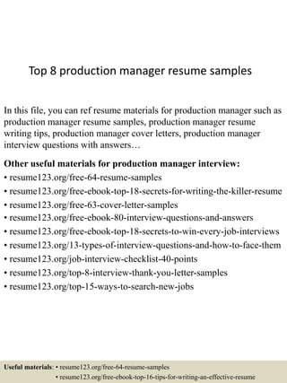 The document provides information about resume formats and samples for production managers. It includes summaries and links to 8 types of resumes (chronological, functional, curriculum vitae, combination, targeted, professional, new graduate, executive). It also provides links to additional resources on resume writing tips and interview questions and answers.