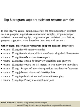 The document provides information on resume samples, templates, and interview materials for a program support assistant position. It includes links to resume examples, cover letter samples, interview questions and answers, resume writing tips, and other career resources. The materials cover different resume formats, fields related to program support, and job levels for the role.