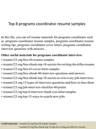 The document provides information about resume samples, templates, and other career resources for programs coordinators. It lists various resume formats (chronological, functional, combination, etc.), resume samples for different career levels (new graduates, executive), and other useful materials for interview preparation, including interview questions, thank you letters, dress codes, and more. All resources are available on the resume123.org website.
