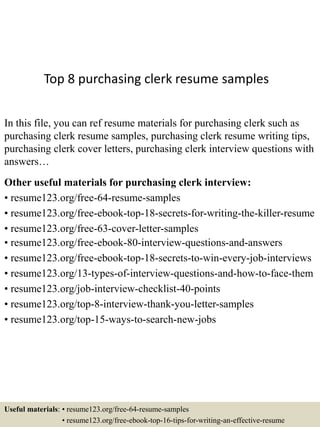 The document provides information about resume samples, cover letters, interview questions, and other resources for purchasing clerks seeking employment. It lists top resume formats including chronological, functional, curriculum vitae, combination, targeted, professional, and executive resumes. It also provides links to purchasing clerk interview preparation materials such as common interview questions, tips for the interview process, and examples of case studies and written tests.