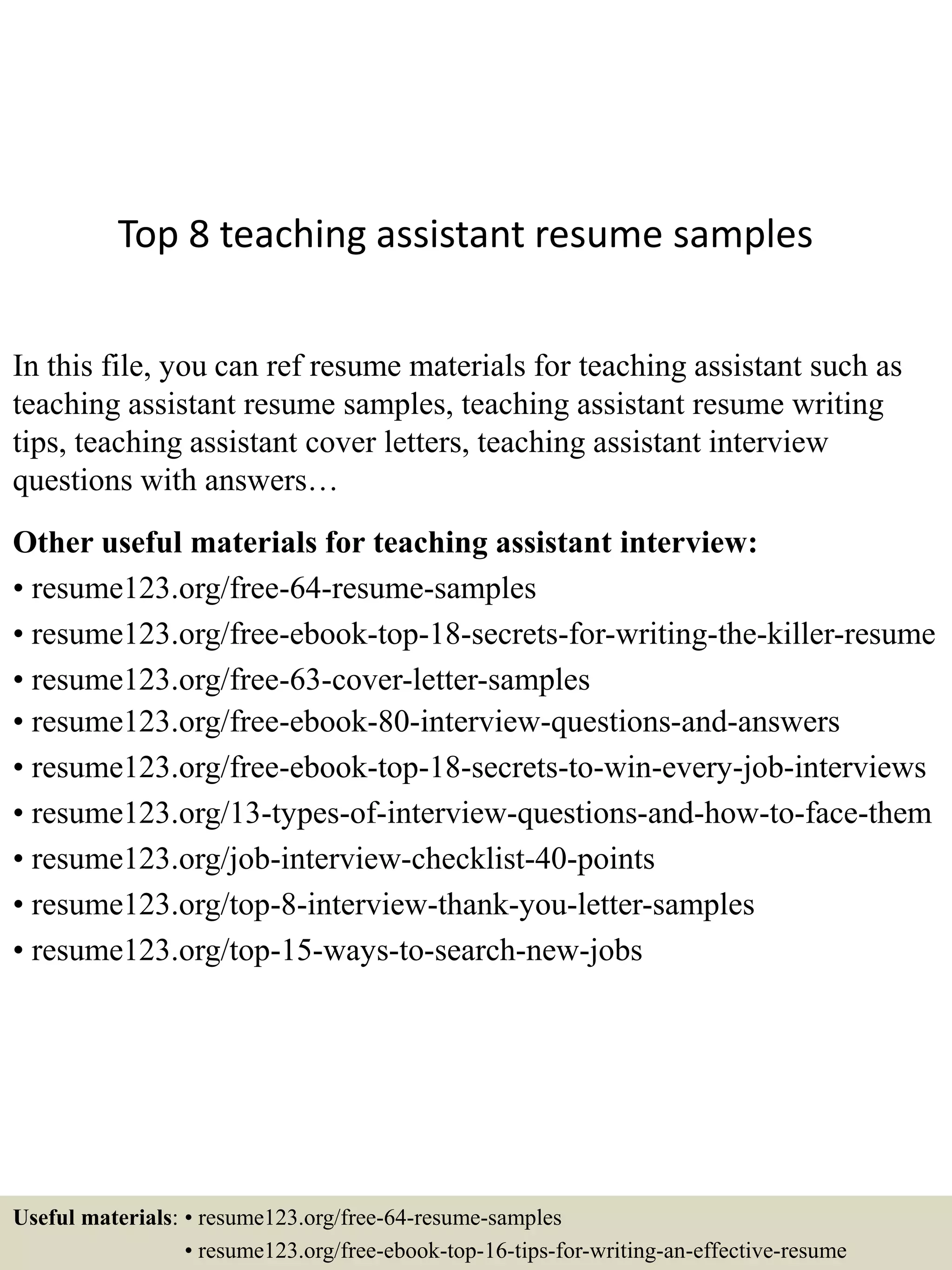 The document provides information about resume samples, templates, and interview tips for teaching assistants. It includes links to resume examples, cover letter samples, interview questions and answers, job interview checklists, and other career resources on the resume123.org website. The resources cover various resume formats, types of interview questions, dress codes for interviews, and how to prepare for and answer common interview questions.