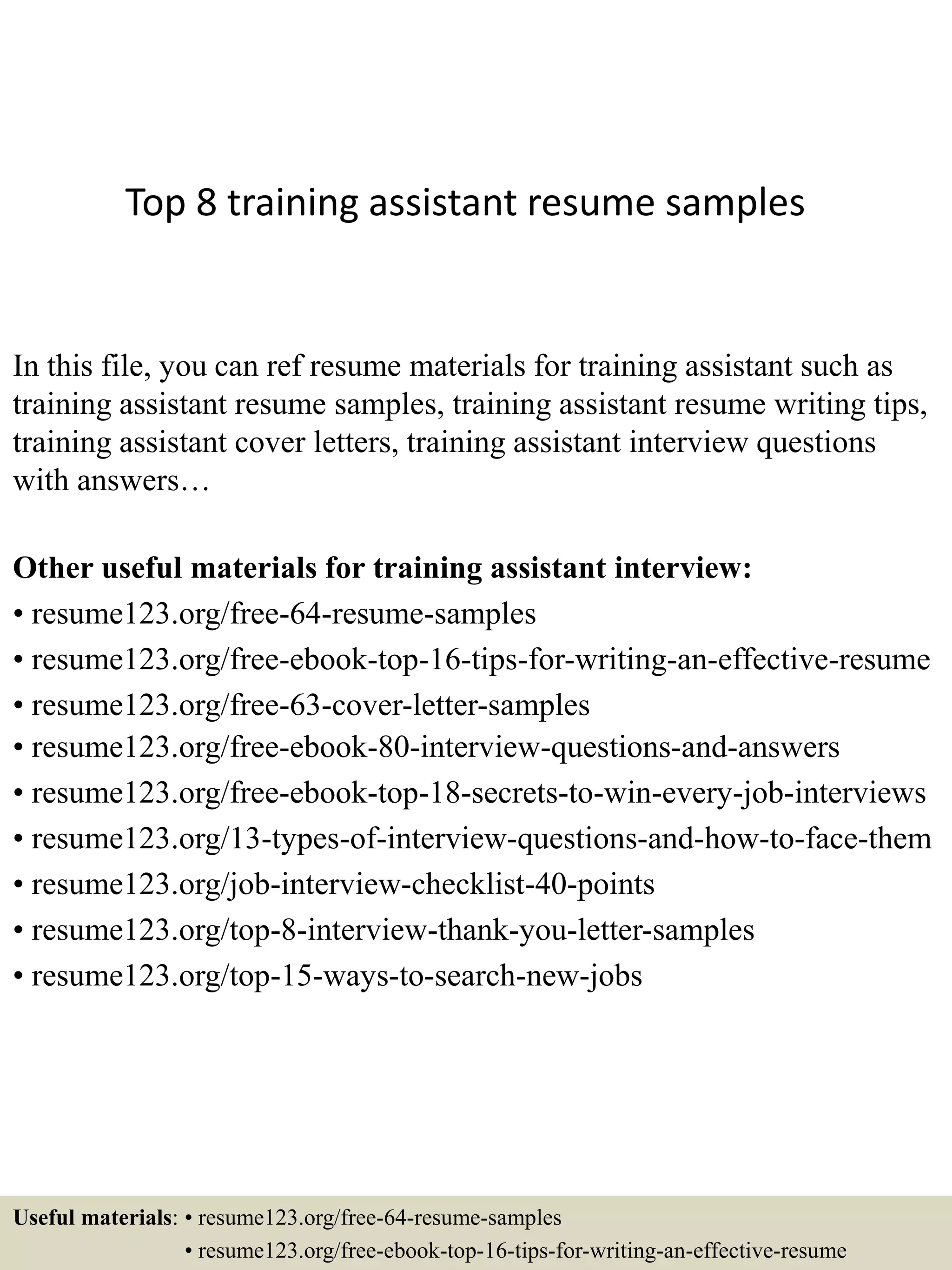 The document provides information about resume samples, cover letters, interview questions, and other resources for training assistants seeking employment. It lists top resume types including chronological, functional, curriculum vitae, combination, targeted, professional, new graduate, and executive resumes. It also provides links to additional resume samples, tips for writing effective resumes, cover letter samples, interview questions, and other job search resources on the resume123.org website.