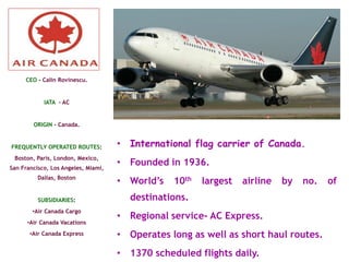 - Air Canada is Canada's largest airline and flag carrier. It operates over 1,370 scheduled flights daily to major destinations across Canada, the U.S., Latin America, Europe, Asia, and Australia.