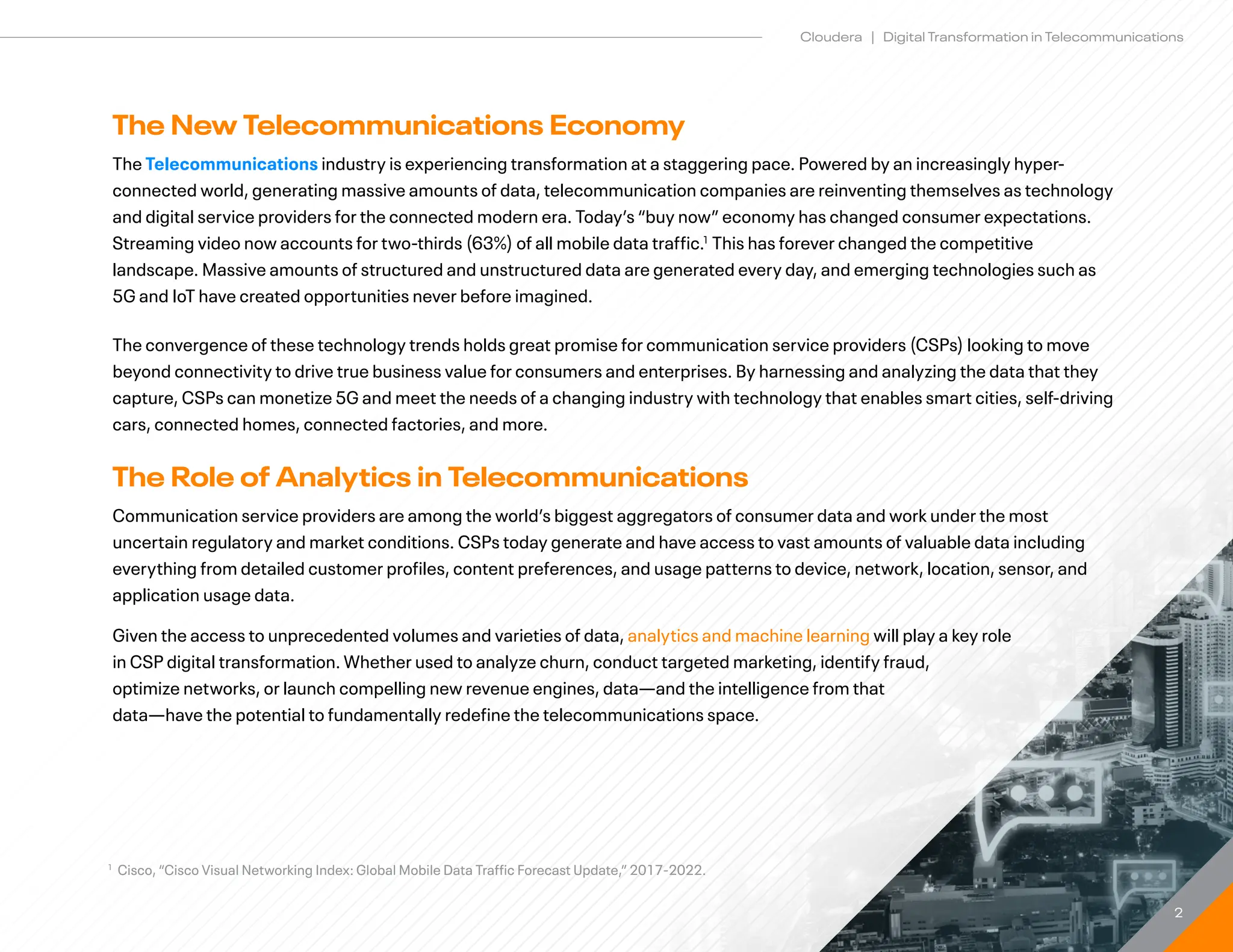 CSPs generate vast amounts of data from customers, networks, devices, and applications. Analytics and machine learning play a key role in CSP digital transformation by analyzing this data to enhance customer experience, optimize networks, reduce costs and fraud, and enable new revenue streams. The top use cases for telecom analytics are customer experience optimization, IoT and digital services, network optimization, and operational analytics like cybersecurity and revenue assurance. As 5G networks are deployed, generating even more data, CSPs can use analytics to capitalize on new 5G opportunities and monetize their investments.