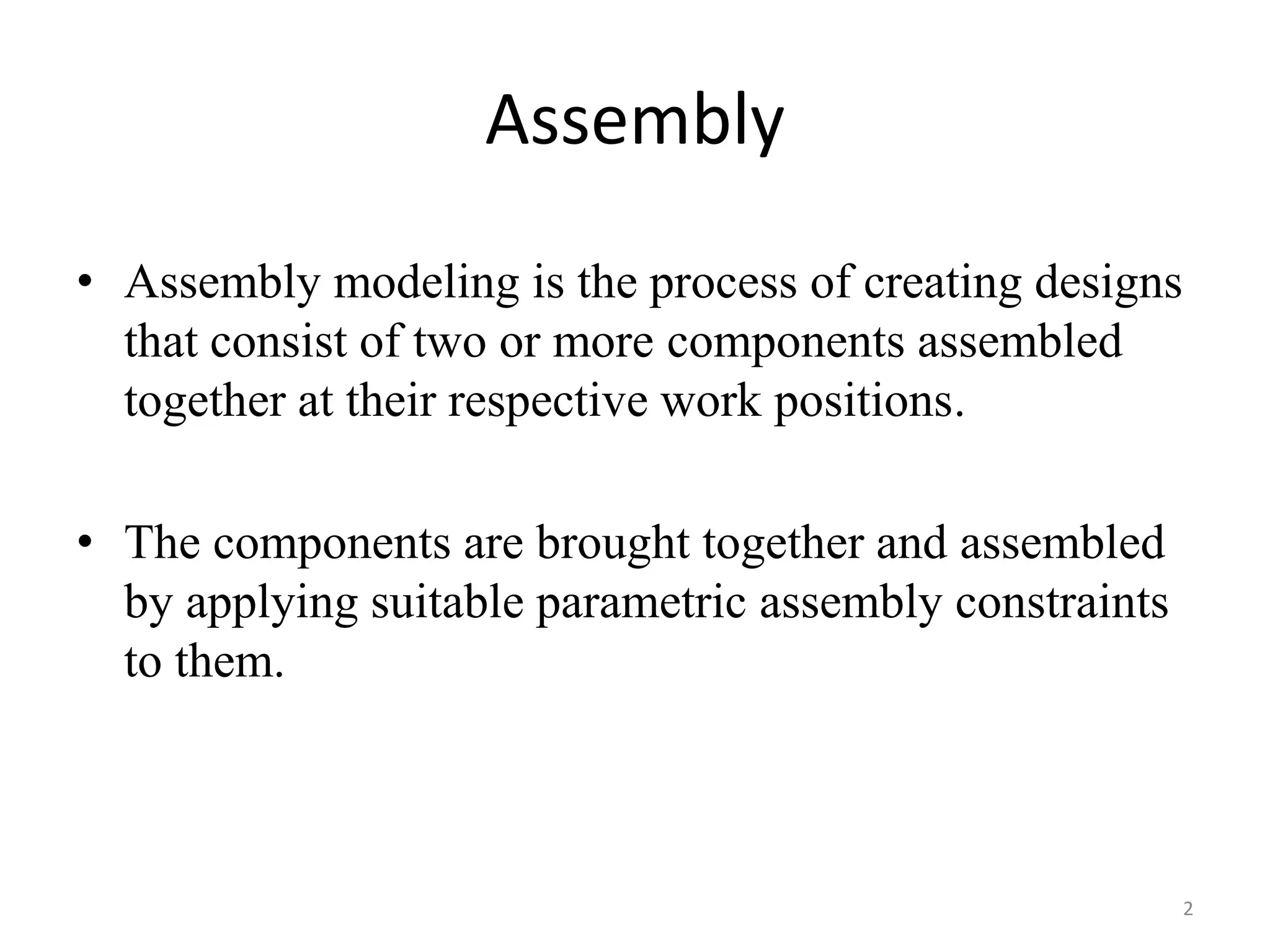 Assembly modeling involves creating designs from components using parametric assembly constraints.