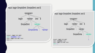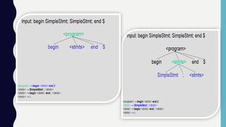 - Parsing is the process of analyzing a string of tokens based on the rules of a formal grammar. It involves constructing a parse tree that represents the syntactic structure of the string based on the grammar.