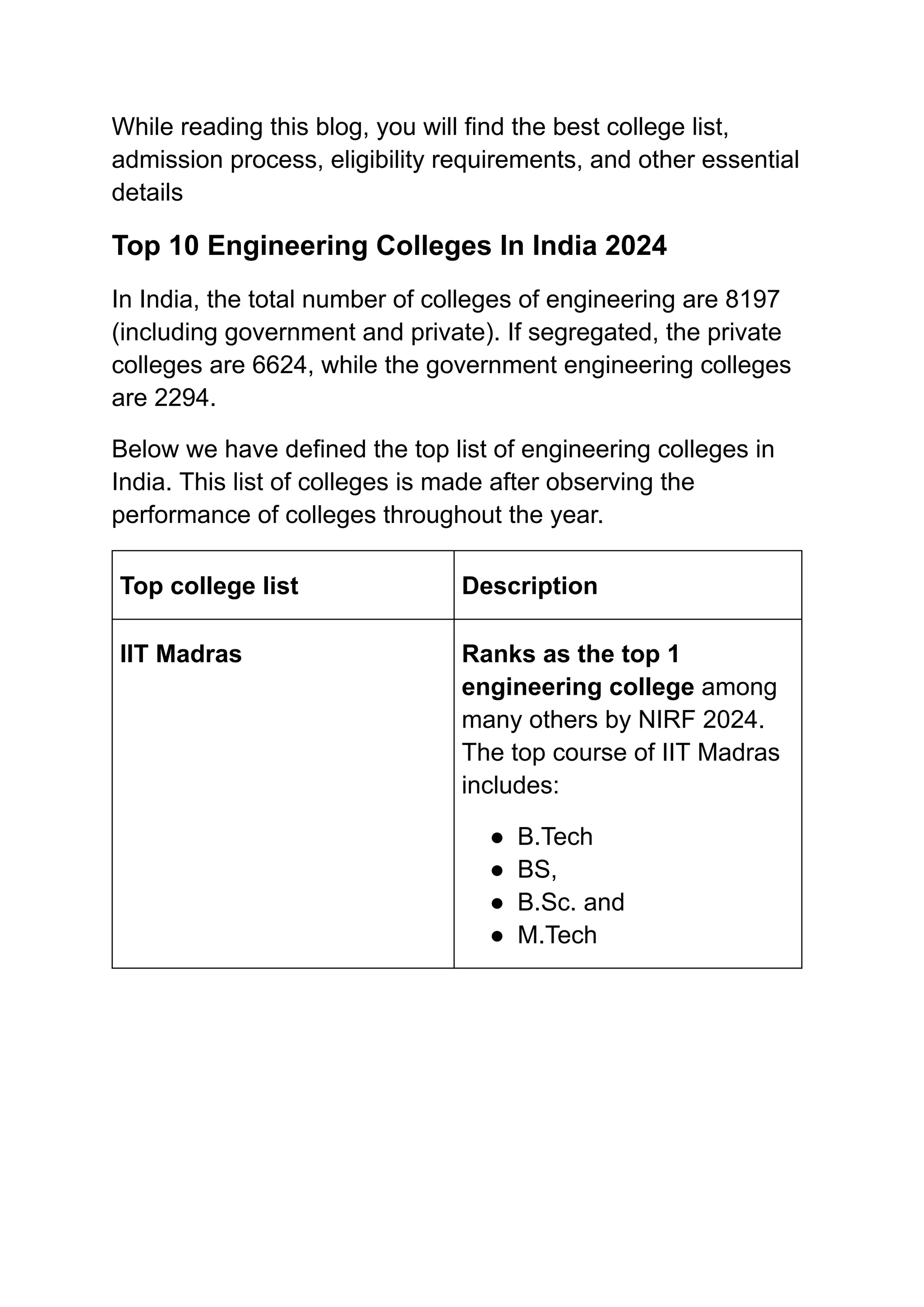 The document provides a comprehensive list of the top engineering colleges in India for 2024, including both private and government institutions, along with details about fees, admission procedures, and popular courses. It features rankings from NIRF, with IIT Madras, IIT Delhi, and IIT Bombay being the top three colleges. Additionally, it discusses entrance exams, placement statistics, and frequently asked questions for prospective students.
