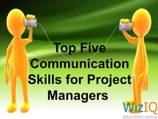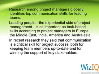 The document discusses the top five communication skills for project managers according to research among global project managers. The top five skills are: 1) Active listening to understand others, 2) Building relationships based on trust and respect, 3) Setting clear priorities to convey the project strategy, 4) Enabling collaboration where team members support each other, and 5) Conveying the organization's vision so team members understand how the project fits into overall business aims. Communication skills are critical for project success in keeping teams informed and gaining stakeholder support.