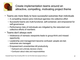 The document provides five ideas for successful project management: 1) Create implementation teams around a compelling vision and mission; 2) Identify the value beneficiaries will receive from outcomes; 3) Accept that requirements will change and evolve outcomes incrementally; 4) Plan, work, and deliver incrementally in small batches; 5) Manage by focusing on the effort remaining to complete outcomes rather than percentage of work done.