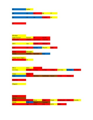 The document lists various automobile manufacturers and some of their popular models. It includes brands such as Alfa Romeo, Aston Martin, Audi, BMW, Bentley, Citroen, Dodge, Ferrari, Ford, Honda, Hyundai, Jaguar, Jeep, Kia, Lamborghini, Land Rover, Lexus, Lotus, Maserati, Mazda, Mercedes-Benz, Mini, Mitsubishi, Nissan, Porsche, Subaru, Suzuki, Toyota, Volkswagen, and Volvo. For each manufacturer, 2-5 popular past or current vehicle models are provided.