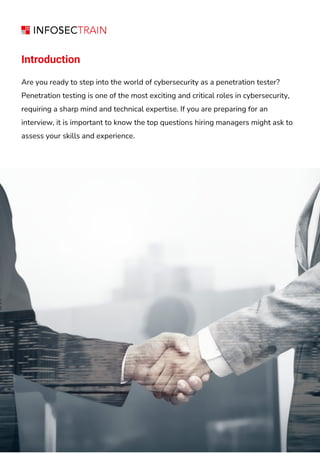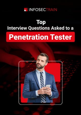 The document outlines essential interview questions for penetration testers in cybersecurity, covering foundational concepts like information security, buffer overflows, and different types of testing. It highlights the necessity of penetration testing for identifying vulnerabilities and strengthening an organization's security posture, detailing the importance of various testing methods and security principles. Key terms and definitions related to vulnerabilities, security risks, and testing methodologies are also included.