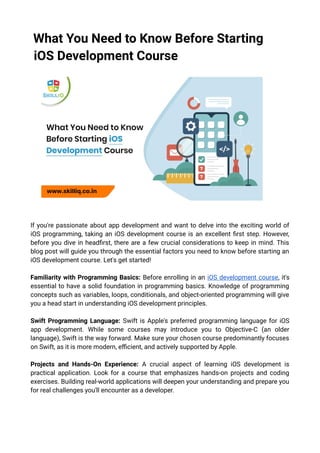Before starting an iOS development course, it's important to have a solid foundation in programming basics and to choose a course that focuses on Swift, Apple's preferred programming language. Look for courses that emphasize hands-on projects and ensure they are updated regularly to cover the latest iOS technologies. Community support is also crucial, so seek courses that offer interactive forums and instructor assistance.