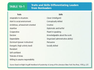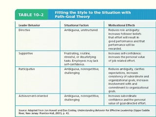 The document discusses key aspects of effective leadership and management. It provides principles for leading people, such as knowing your job, setting an example, caring for people, communicating, educating, equipping, motivating teams, and developing teamwork. It also discusses characteristics of high-performing teams, including participative leadership, shared responsibility, common purpose, communication, and being future-focused. Overall, the document emphasizes the importance of competent leadership, developing teams, and focusing on people to achieve goals in complex and unpredictable work environments.