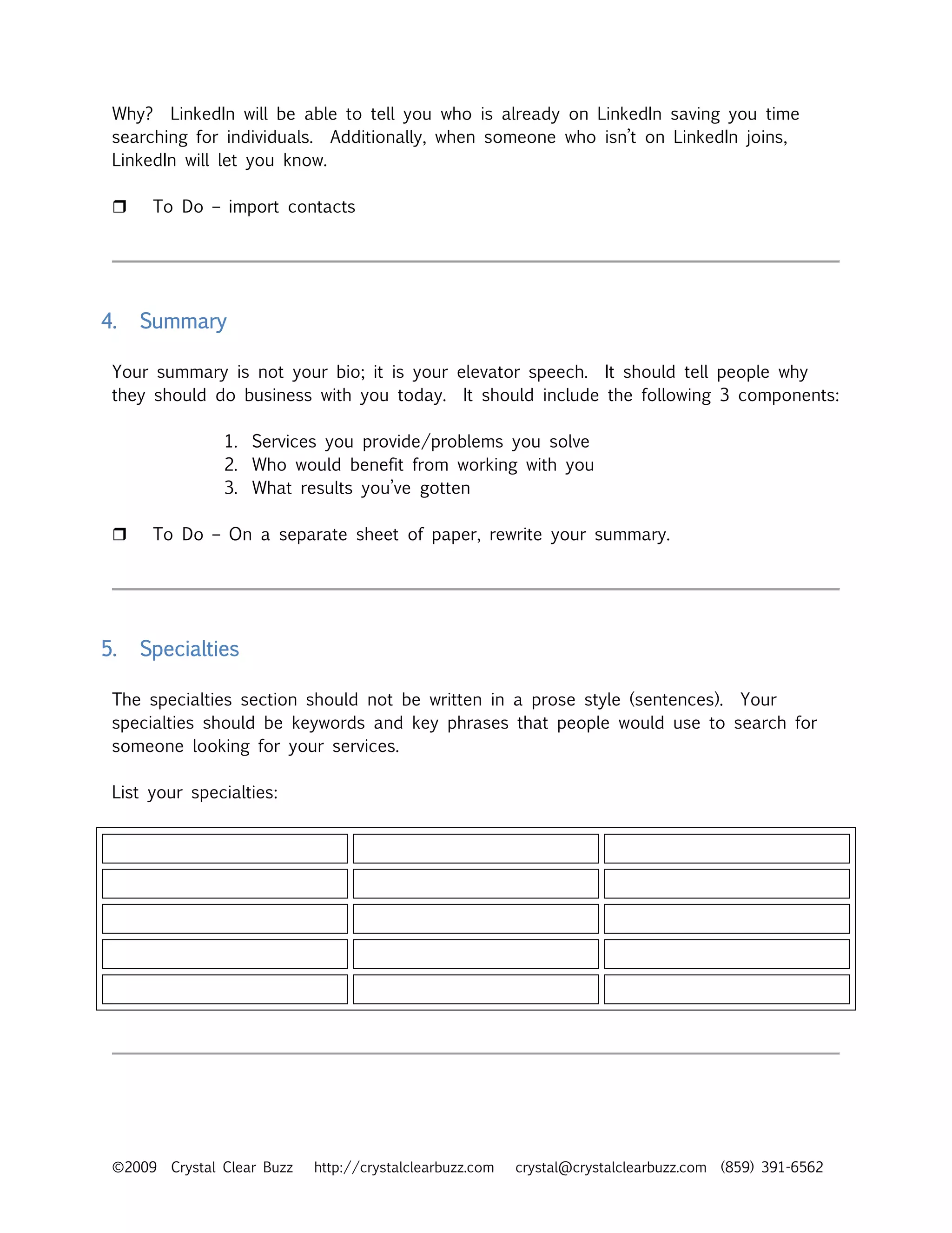 The document provides 13 tips for optimizing a LinkedIn profile, including guidance on crafting a compelling headline, summary, and showcasing specialties. It emphasizes the importance of actively engaging with connections, gathering recommendations, and participating in groups to enhance networking and visibility. Additionally, the document offers suggestions for utilizing LinkedIn features such as status updates and introductions to foster professional relationships.