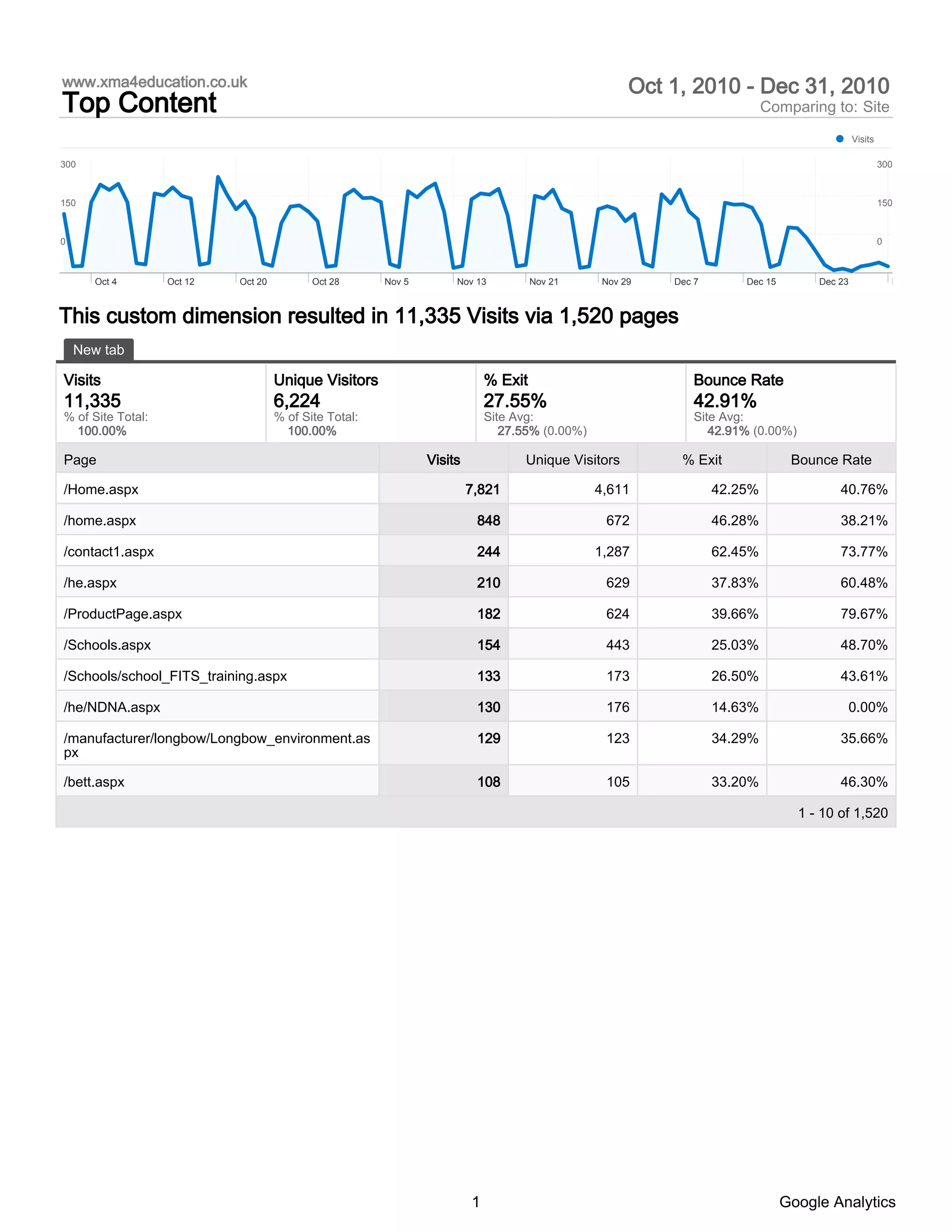 This document summarizes website analytics data from October 1 to December 31, 2010 for the site www.xma4education.co.uk. It shows that the site received 11,335 visits from 6,224 unique visitors during this period. The top page was /Home.aspx with 7,821 visits and 4,611 unique visitors. The site had an average exit rate of 27.55% and bounce rate of 42.91%.