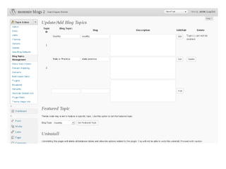 Multisite, also known as a WordPress network, allows for multiple sites to run under one WordPress installation. Plugins are available to add functionality like pulling posts across sites, mapping custom domains to individual sites, controlling plugin and theme usage, and managing users across the network. The document recommends several plugins for multisite networks that add features like broadcasting posts to multiple sites, setting defaults for new sites, customizing CSS per site, and providing statistics on plugin and theme usage.