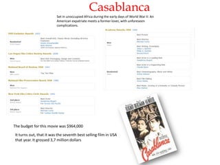 Casablanca had a budget of $964,000 and grossed $3.7 million, making it the seventh best selling film that year in the USA. Vertigo had a budget of $2,479,000 and grossed $14 million. Eternal Sunshine of the Spotless Mind had a budget of $20 million and grossed $72,258,126.
