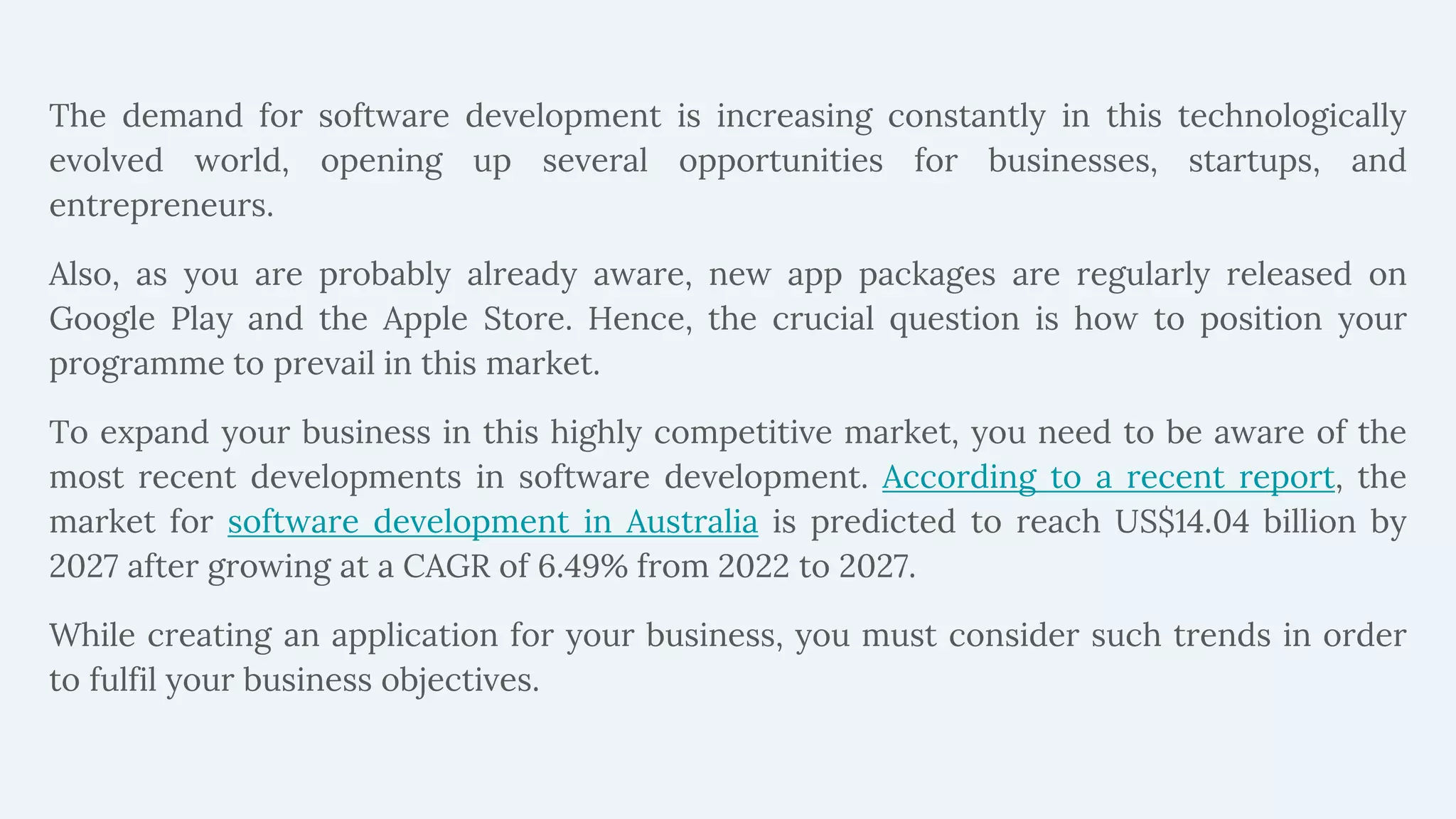 The document discusses the increasing demand for software development and highlights key trends for 2023 such as low-code/no-code development, cloud computing, and the Internet of Behavior. It emphasizes the importance of adapting to these trends to remain competitive in the ever-evolving software market, with projections for the Australian software development market to reach $14.04 billion by 2027. The document concludes by urging businesses to stay updated with technological advancements to effectively meet their objectives.
