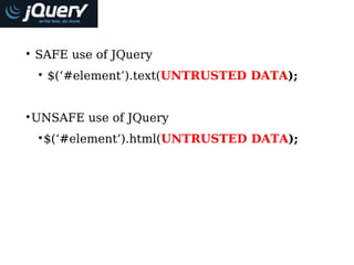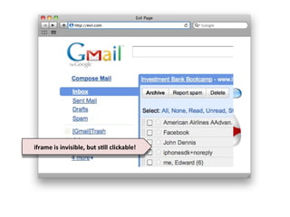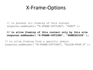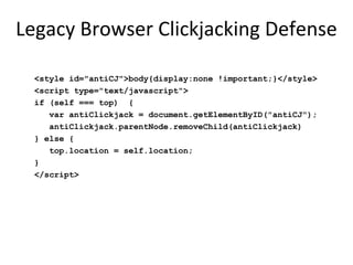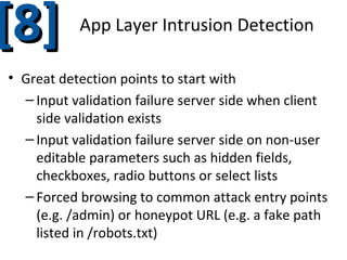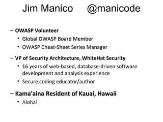 The document outlines the top ten web application defenses, emphasizing that developers need to be aware of numerous security issues beyond a simple top ten list. It discusses key concepts such as SQL injection, password storage, multi-factor authentication, XSS defenses, and CSRF protections, providing numerous examples and best practices for each. The document serves as a comprehensive resource aimed at enhancing security in web application development.