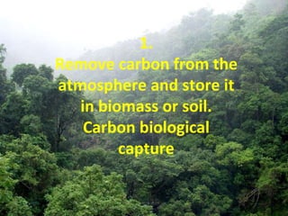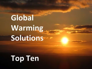 The document lists 10 global warming solutions: 1) Remove carbon from the atmosphere and store it in biomass or soil, 2) Capture carbon and store it underground, 3) Produce bio-products that reduce greenhouse gases, 4) Contain methane emissions from landfills, livestock, coal mines, and natural gas facilities, 5) Establish markets for buying and selling greenhouse gas reduction credits, 6) Improve electric and heating efficiency to reduce emissions and costs, 7) Increase vehicle efficiency through improved engines, transmissions, aerodynamics, and tires, 8) Increase wind and solar power which produce no emissions, 9) Develop low-carbon energy systems like hydrogen and electricity, 10) Make diesel vehicles and fuels cleaner
