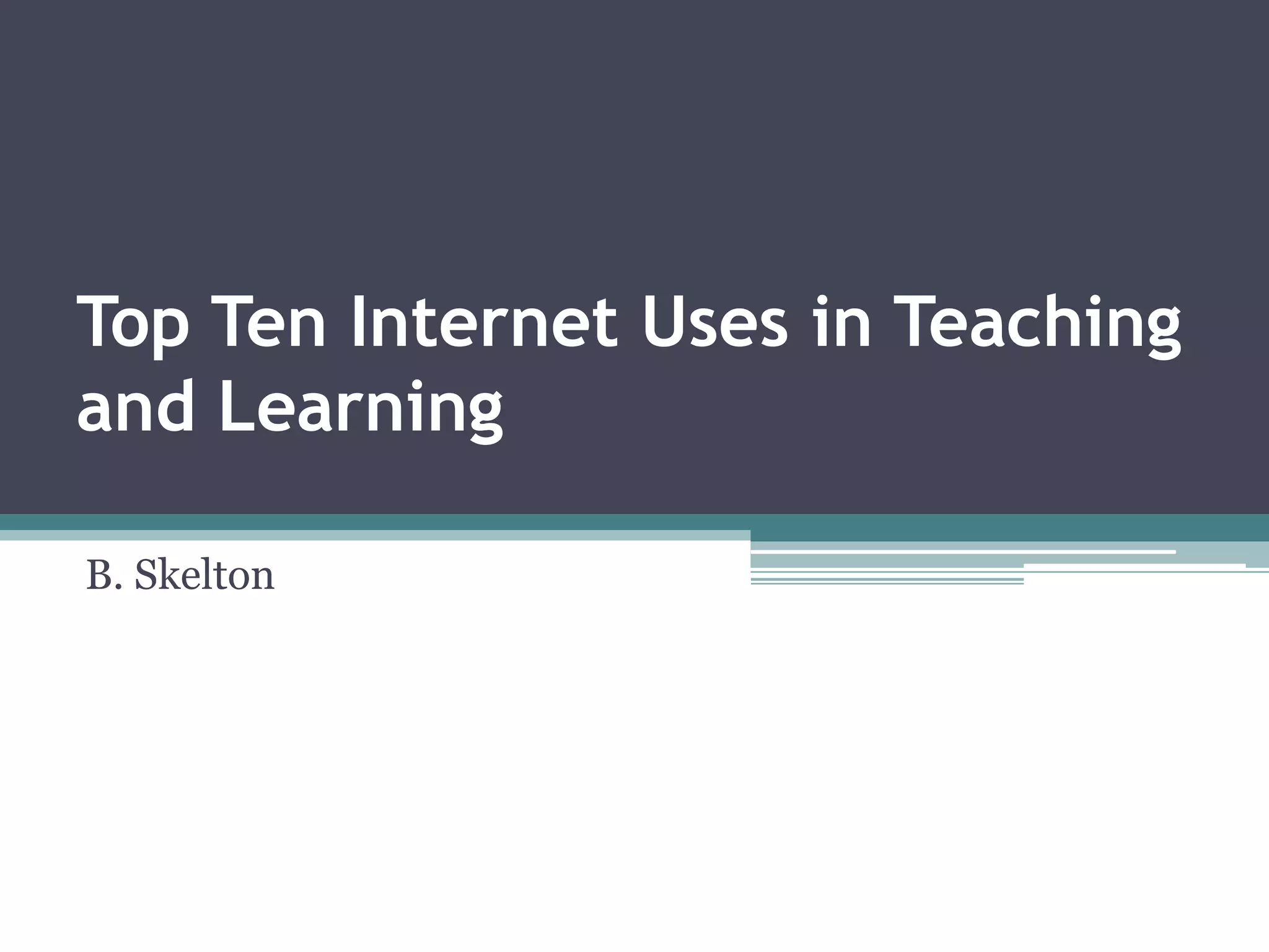 This document outlines 10 top internet uses for teaching and learning: 1) Blogs allow teachers to share information and students to sharpen writing skills, 2) Presentation programs like Prezi offer interactive visual presentations, 3) Wikis like "Greeting from around the World" enable cultural sharing, 4) Digital slideshow programs let students personalize stories with photos and video, 5) Word clouds like Wordle let users visualize text data, 6) Website builders require no coding experience to create sites, 7) Cloud apps like Dropbox offer file storage anywhere, 8) Social networks like Schoolology organize classes and resources, 9) Web videos provide cheap subject content, and 10) Online schools provide flexible scheduling.