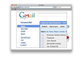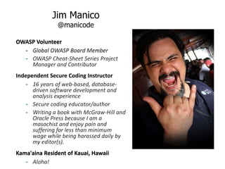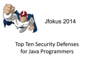 The document outlines the top ten security defenses for Java programmers, including techniques for preventing SQL injection, secure password storage, defending against cross-site scripting (XSS), and ensuring secure communications with encryption. It emphasizes the importance of using strong libraries and standards, such as OWASP's Java Encoder and HTML Sanitizer, to protect against common vulnerabilities. Additionally, it advocates for multi-factor authentication and robust access control policies to enhance overall application security.