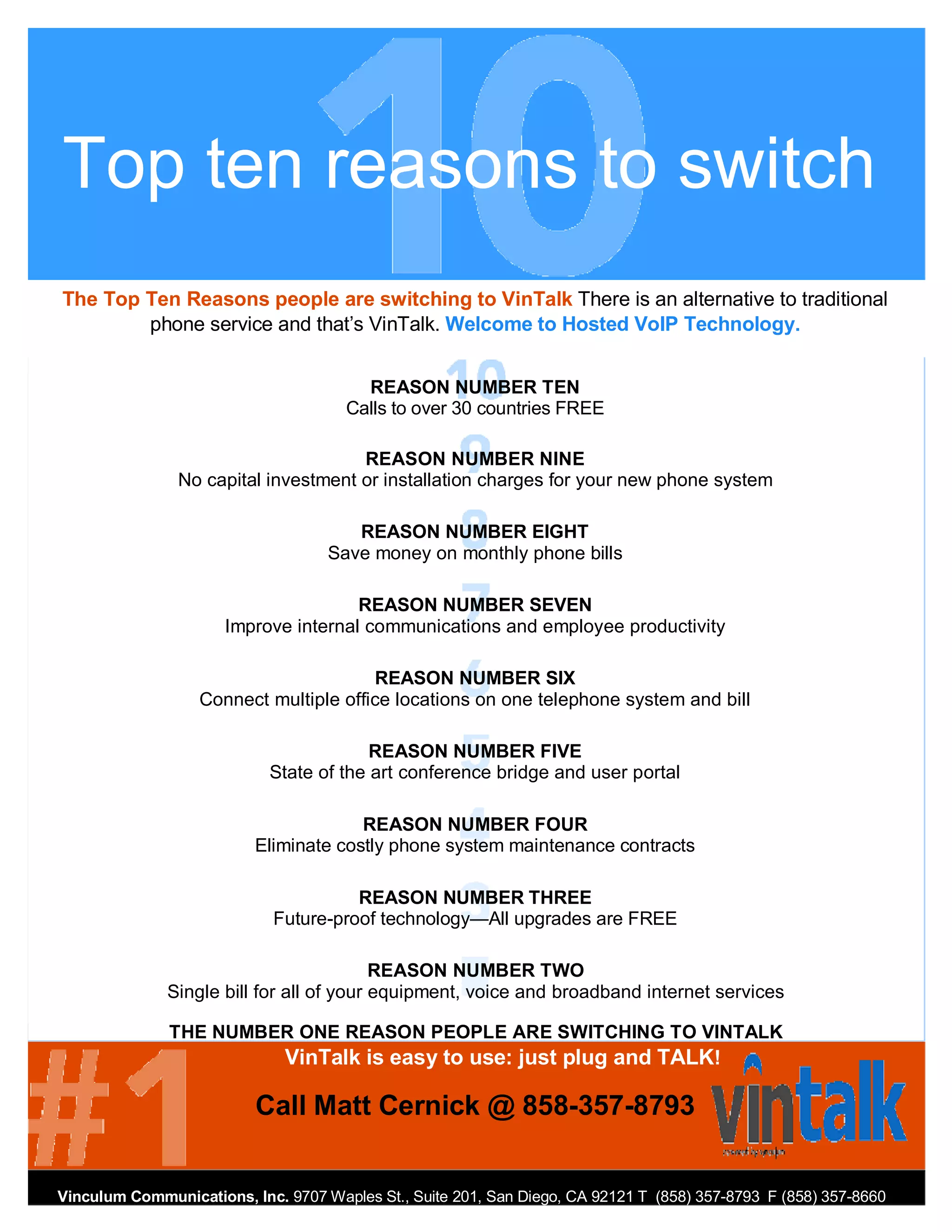 VinTalk is an alternative to traditional phone service that offers hosted VoIP technology with top ten reasons for switching including free calls to over 30 countries, no installation or capital costs, saving on monthly bills, improving productivity, connecting multiple office locations on one system, free upgrades, and a single bill for equipment and services.