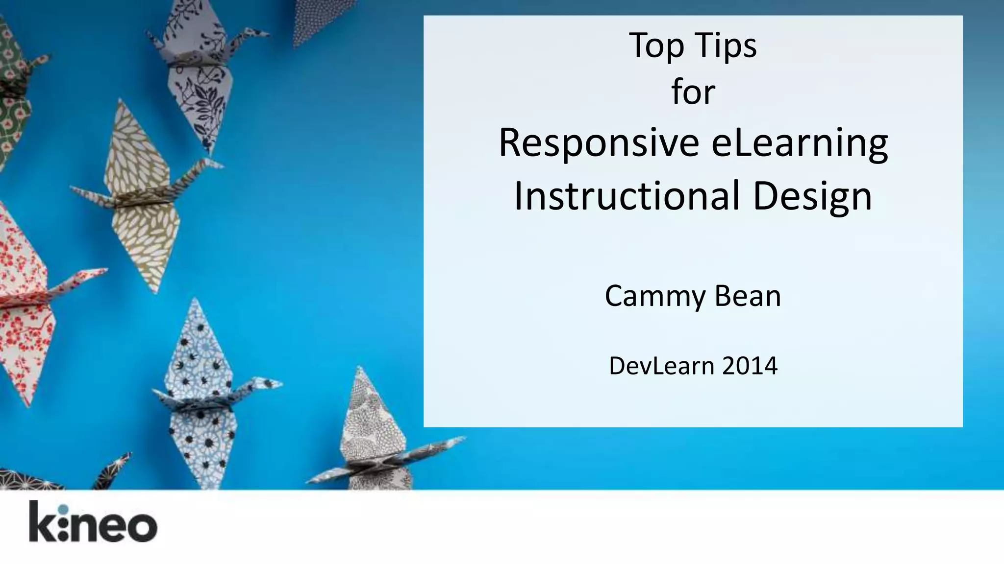The document discusses essential tips for creating responsive eLearning designs that cater to various devices. It emphasizes the importance of designing content that can adapt across screens, leveraging web technologies like HTML, CSS, and JavaScript, while considering user experience and accessibility. Key recommendations include prioritizing mobile usability, structuring content effectively, and engaging users through interactive design and storytelling.