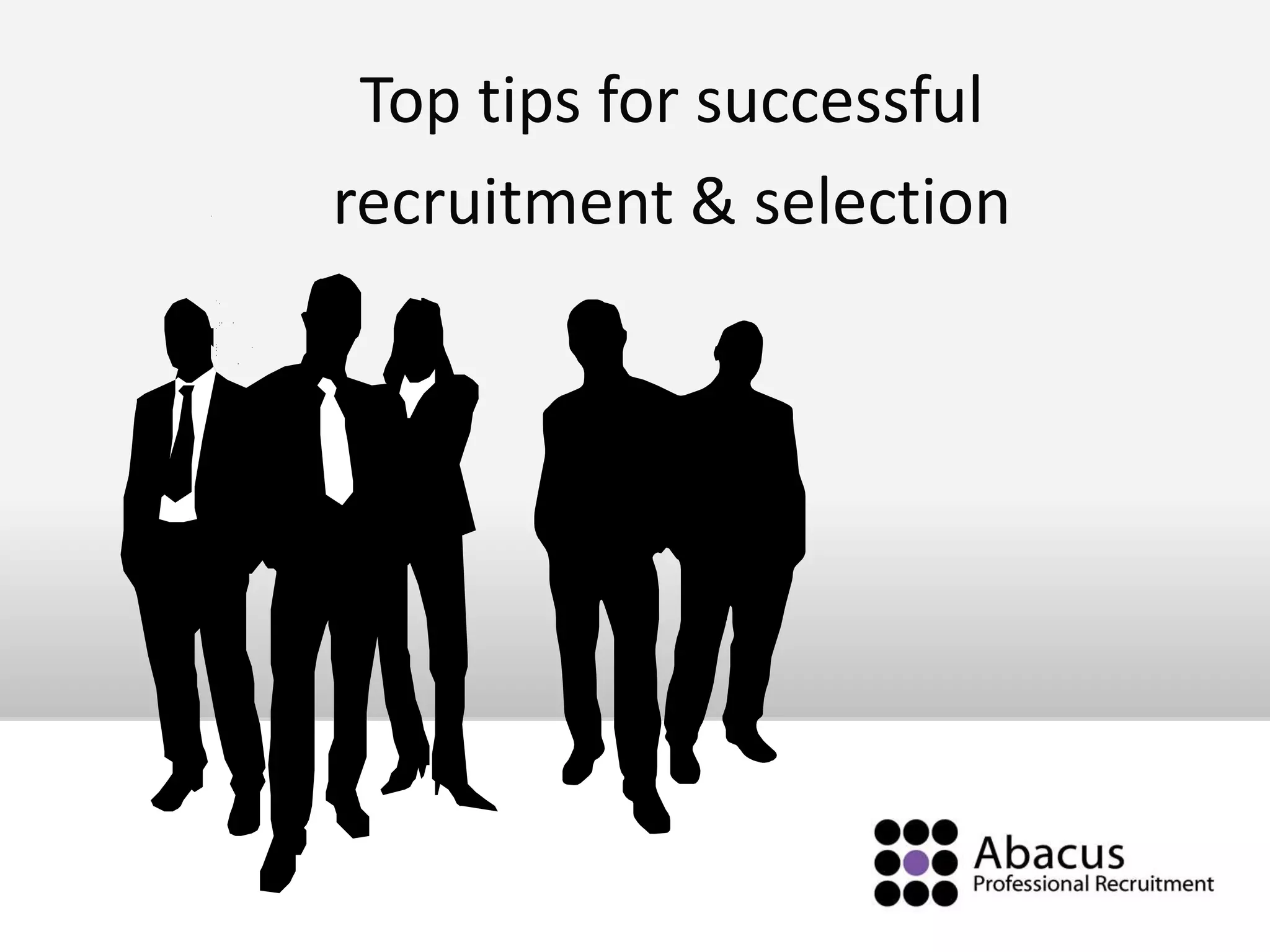 The document outlines best practices for effective recruitment and selection processes, emphasizing preparation, clear job specifications, and diverse recruitment strategies. It also highlights the importance of standardized interviews and avoiding bias, ensuring transparency, and communicating essential job details to candidates. Additionally, it provides an overview of Abacus, a recruitment company established in 2003, and includes contact information for its business directors.