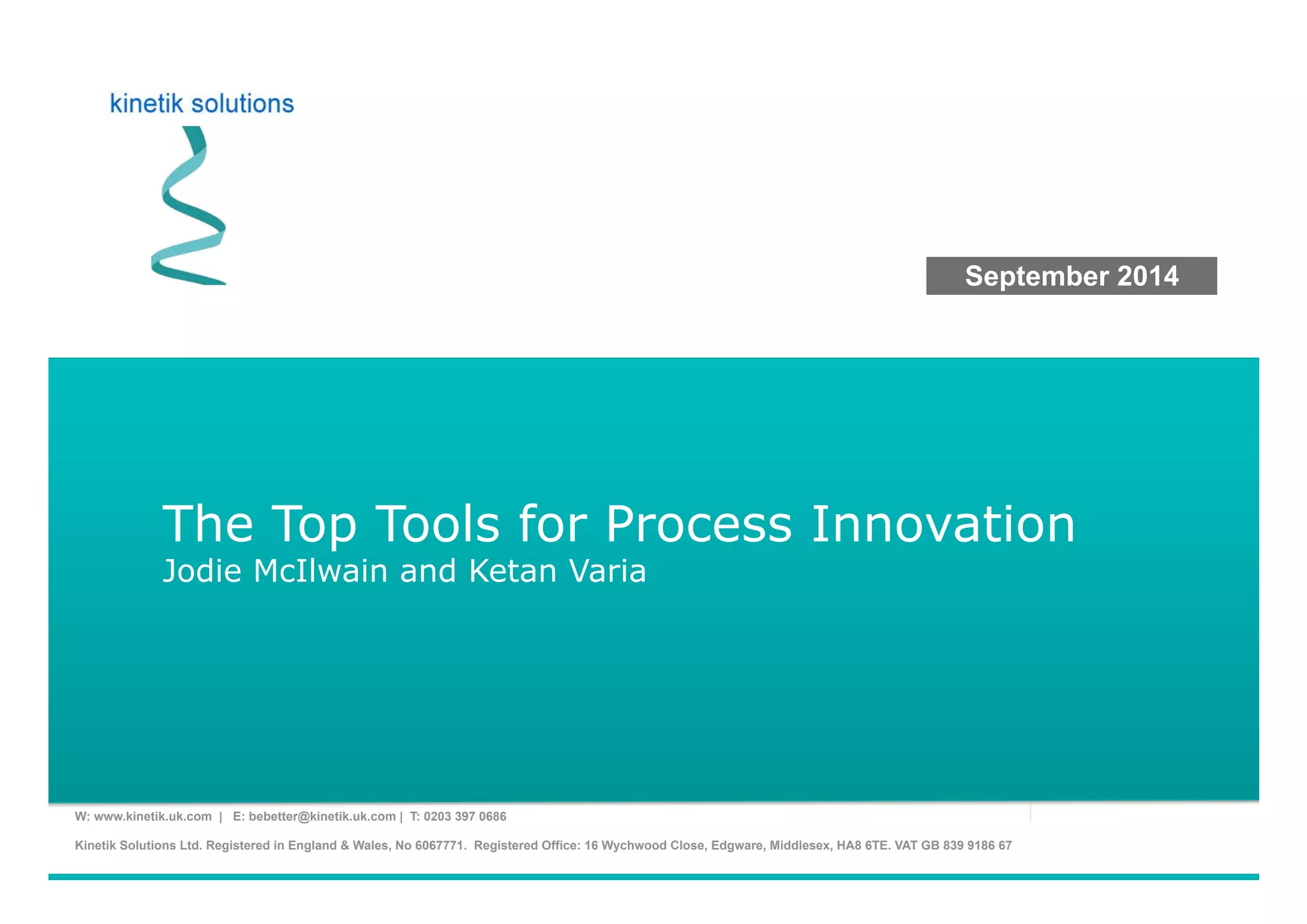 This document discusses process innovation tools and their benefits. It outlines three tools - TRIZ, breaking assumptions, and SCAMPER. TRIZ helps solve problems by understanding conflicts and better using resources. Breaking assumptions leads to innovative solutions by challenging current thinking. SCAMPER prompts new ideas through substituting, combining, or modifying existing processes. Process innovation tools allow organizations to radically improve processes rather than just incrementally change them.