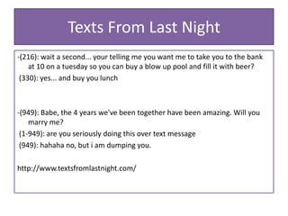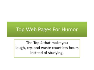 This document summarizes 4 popular humor websites: Texts From Last Night shares amusing or awkward text message conversations; F My Life features embarrassing true stories submitted by readers; LOL Cats shares photos of cats with funny captions written in broken English; and Fail Blog collects photos of humorous failures, mistakes and mishaps. These sites provide entertainment through sharing relatable comedic situations and mistakes.