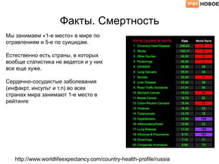 Документ обсуждает проблемы здравоохранения в России, включая низкую продолжительность жизни и высокие показатели смертности. Рассматриваются различные бизнес-модели и стартапы в сфере медицины, которые могут помочь улучшить ситуацию. Подчеркивается необходимость изменений в системе здравоохранения и выявляются выгоды для разных участников, включая страховые компании и медицинские учреждения.